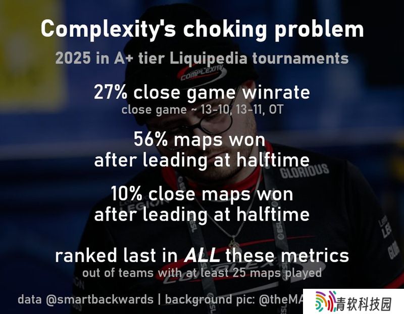 尽管首图以两分优势取胜,但在参与至少25张A级或S级赛事地图、且比分胶着至13-10或更接近(含加时)的队伍中,Complexity仍是表现最差的一支。