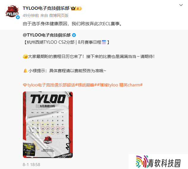 TYLOO电子竞技俱乐部在微博上宣布将放弃此次ECL赛事,原因是选手身体健康原因,意味着L4S将直接获胜。
