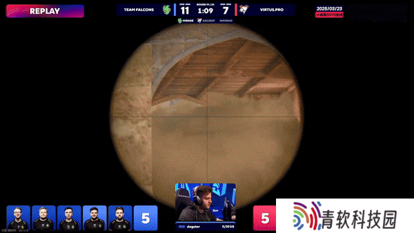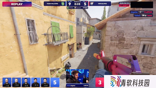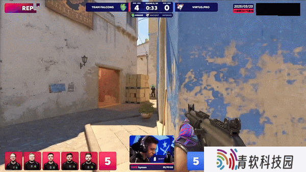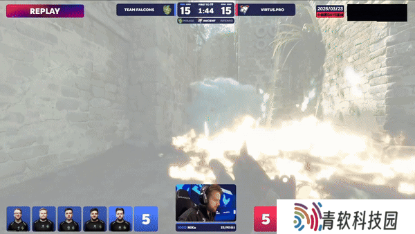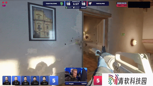 攻防转换。CT第二时间蕉道反清打死带道具土匪,队友干拉飞二楼全部被接,Falcons拿下下半场手枪局。